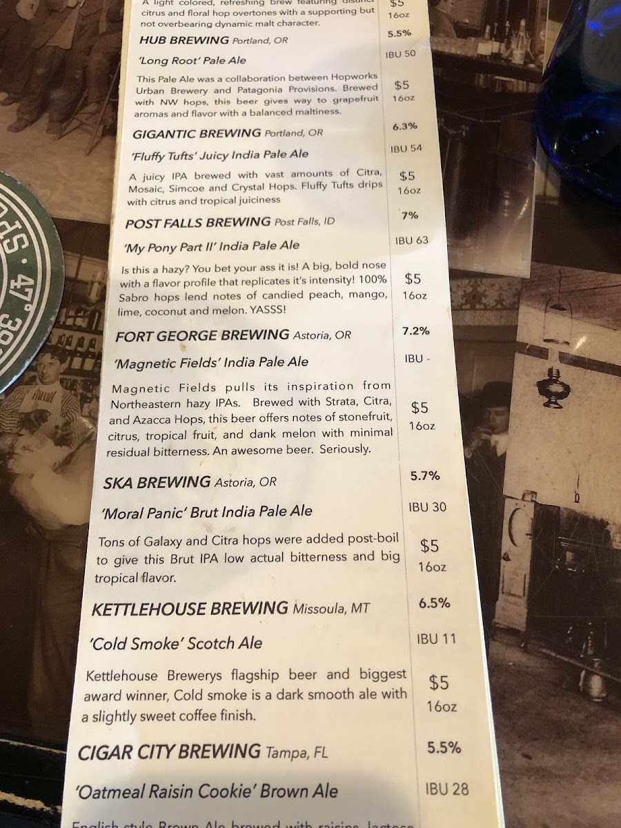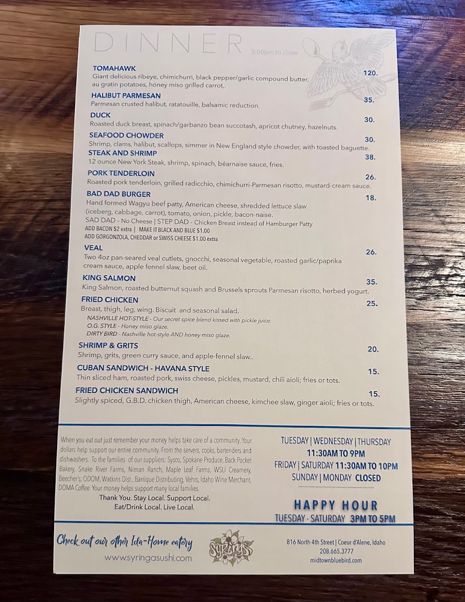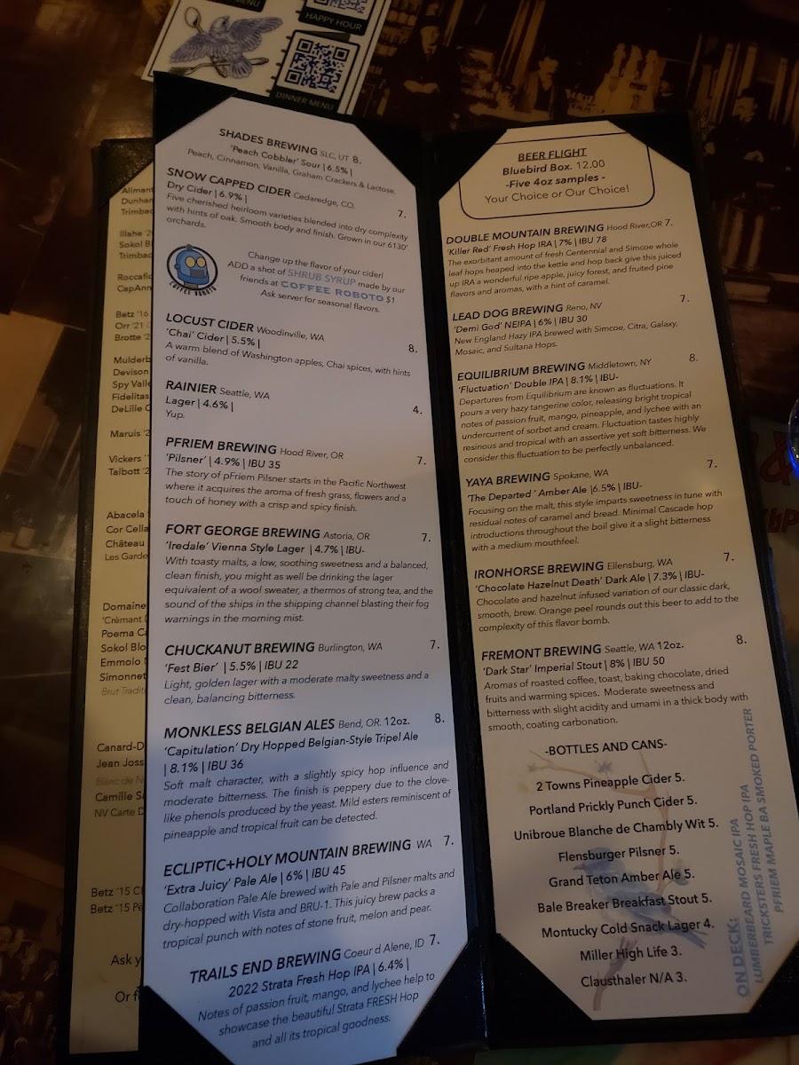 Welcome to Midtown Bluebird, a hidden gem located at 816 N 4th St, Coeur d'Alene, ID. This charming establishment features a thoughtfully curated menu that celebrates the art of flavorful brews. As you explore the offerings, don't miss the Ska Brewing Astoria—a refreshing brut India Pale Ale bursting with tropical notes from galaxy and citra hops, and boasting a low bitterness that makes it incredibly drinkable at 5.7% ABV. Alternatively, indulge in the Hub Brewing’s Long Root Pale Ale, a collaboration that delivers vibrant grapefruit aromas and showcases the essence of North West hops.
